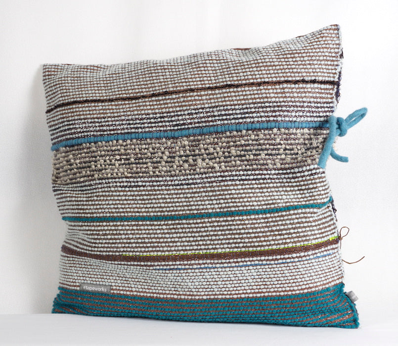 Mit einem Ohr im Himmelblau, mit dem anderen ganz bei sich. Nicht nur fürs Auge, auch für die Finger erzählt das Kunstkissen seine Geschichten. Mohairschlinge, Papiergarn, dicke Filzschnur, hier findet sich viel zu ertasten.